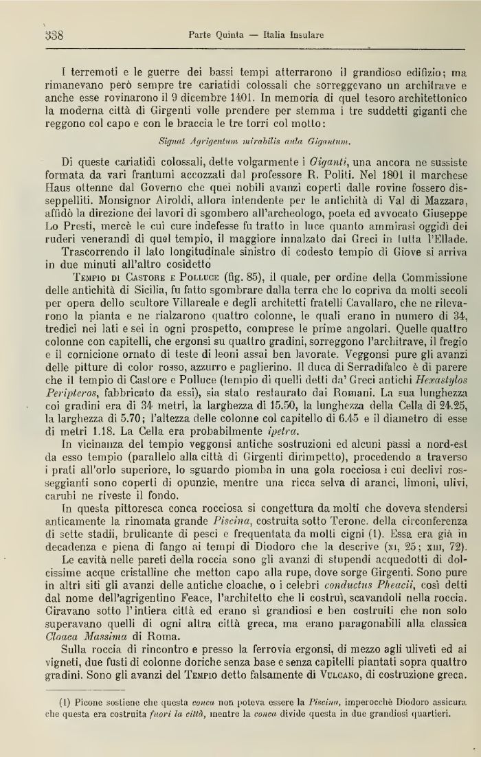 Tempio dì Castore f Poi.luce (fig. 85), il quale, per ordine della Commissione delle antichità dì Sicilia, fu fatto sgombrare dalla terra che lo copriva da molti secoli per opera dello scultore Villareale e degli architetti fratelli Cavallaro, che ne rilevarono la pianta e ne rialzarono quattro colonne, le quali erano in numero di 34, tredici nei lati e sei in ogni prospetto, comprese le prime angolari. Quelle quatlro colonne con capitelli, che ergonsi su quatlro gradini, sorreggono l'architrave, il fregio e il cornicione ornato dì teste dì leoni assai ben lavorate. Veggonsi puro gli avanzi delle pitture di color rosso, azzurro e paglierino. Il duca di Serradifalco è di parere che il tempio di Castore e Polluce (tempio di quelli detti da' Greci antichi Hexastylos Peripteros, fabbricato da essi), sia stato restaurato dai Romani. La sua lunghezza coi gradini era di 34 metri, la larghezza di 15.50, la lunghezza della Cella di 54.25, la larghezza di 5.70; l'altezza delle colonne col capitello di 6.45 e il diametro di esse di metri 1.18. La Cella era probabilmente ipetra.