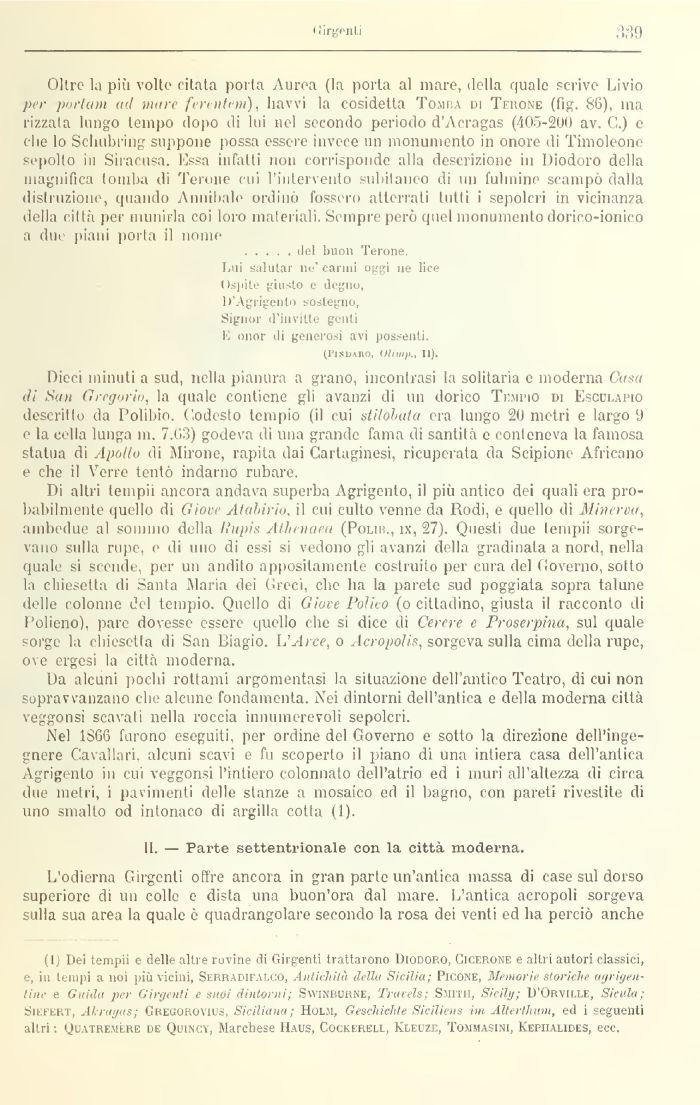(1) Dei tempii e delle altre ruvine di Girgenti trattarono Diodoiìo, Cicerone e altri autori classici, e, i,i tempi a noi più vicini, Serradiealco, Antichità della Sicilia; plcone, Memorie storiche agrigentine e Guida per Girgenti e suoi dintorni; Swinburne, Tvarels; Smith, Sicilg; Li'Orville, Si e ala ; Sieeert, Ali it/as; Grehorovius, Siciliana; Holm, Geschicltte Siciliens im Alterthum, ed i seguenti altri : QuatkemerB de Qihncy, Marchese IIaus, Cocicerell, Kleoze, Tommasini, Kepiialidls, ecc.