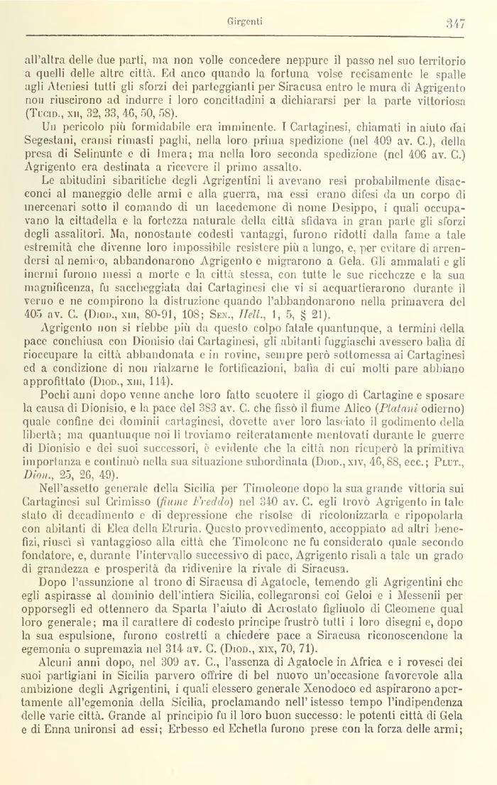 all'altra delle due parti, ma non volle concedere neppure il passo nel suo territorio a quelli delle altre città. Ed anco quando la fortuna volse recisamente le spalle agli Ateniesi tutti gli sforzi dei parteggiatiti per Siracusa entro le mura di Agrigento non riuscirono ad indurre i loro concittadini a dichiararsi per la parte vittoriosa (Tucid., xii, 32, 33, 46, 50, 58).