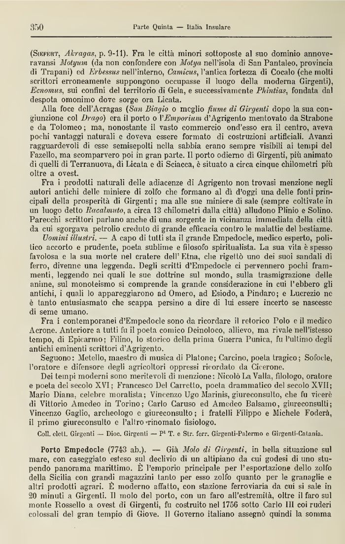 Alla foce dell'Acragas (San Biagio o meglio fiume di Girgenti dopo la sua congiunzione col Drago) era il porto o YEmpormm d'Agrigento mentovato da Strabene e da Tolomeo ; ma, nonostante il vasto commercio ond'esso era il centro, aveva pochi vantaggi naturali e doveva essere formato di costruzioni artificiali. Avanzi ragguardevoli di esse semisepolti nella sabbia erano sempre visibili ai tempi del Fazello, ma scomparvero poi in gran parte. Il porto odierno di Girgenti, più animato di quelli di Terranuova, di Licata e di Sciacca, è situato a circa cinque chilometri più oltre a ovest.