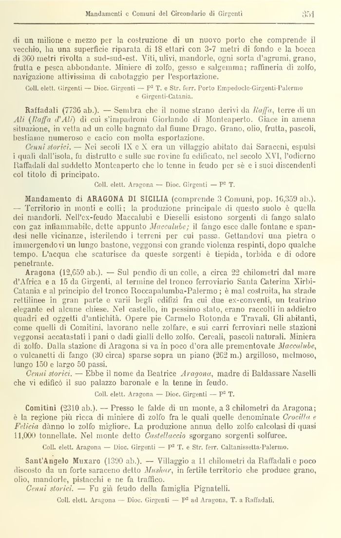Aragona (12,G59 ab.). — Sul pendio di un colle, a circa 22 chilometri dal mare d'Africa e a 15 da Girgenti, al termine del tronco ferroviario Santa Caterina Xirlii-C.atanìa e al principio del tronco Roccapalumba-Palermo ; è mal costruita, ha strade rettilinee in gran parte e varii begli edifizì fra cui due ex-conventi, un teatrino elegante ed alcune chiese. Nel castello, in pessimo stato, erano raccolti in addietro quadri ed oggetti d'antichità. Opere pie Carmelo Rotonda e Travali. Gli abitanti, come quelli di Comitini, lavorano nelle zolfare, e sui carri ferroviari nelle stazioni veggonsi accatastati i pani o dadi gialli dello zolfo. Cereali, pascoli naturali. Miniera di zolfo. Dalla stazione di Aragona si va in poco d'ora alle prementovate Maccalube, o vulcanetii di fango (30 circa) sparse sopra un piano (2G2 m.) argilloso, melmoso, lungo 150 e largo 50 passi.
