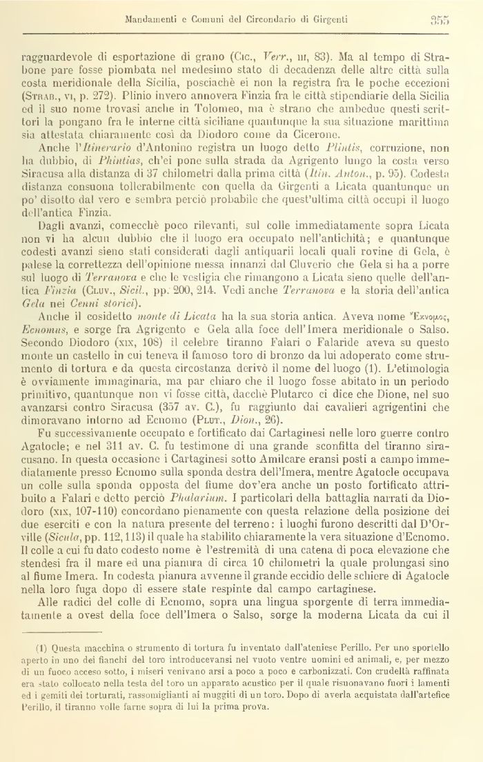 Anche il c.osidetto monte di Licata ha la sua storia antica. Aveva nome Ecnomus, e sorge fra Agrigento e Gela alla foce dell'Imera meridionale o Salso. Secondo Diodoro (xix, 10ò) il celebre tiranno Falari o Falaride aveva su questo monte un castello in cui teneva il famoso toro di bronzo ila lui adoperato come strumento di tortura e da questa circostanza derivò il nome del luogo (1). L'etimologia è ovviamente immaginaria, ma par chiaro che il luogo fosse abitato in un periodo primitivo, quantunque non vi fosse città, dacché Plutarco ci dice che Dione, nel suo avanzarsi contro Siracusa (357 av. C.), fu raggiunto dai cavalieri agrigentini che dimoravano intorno ad Ecnomo (Plut., I)ion., 26).