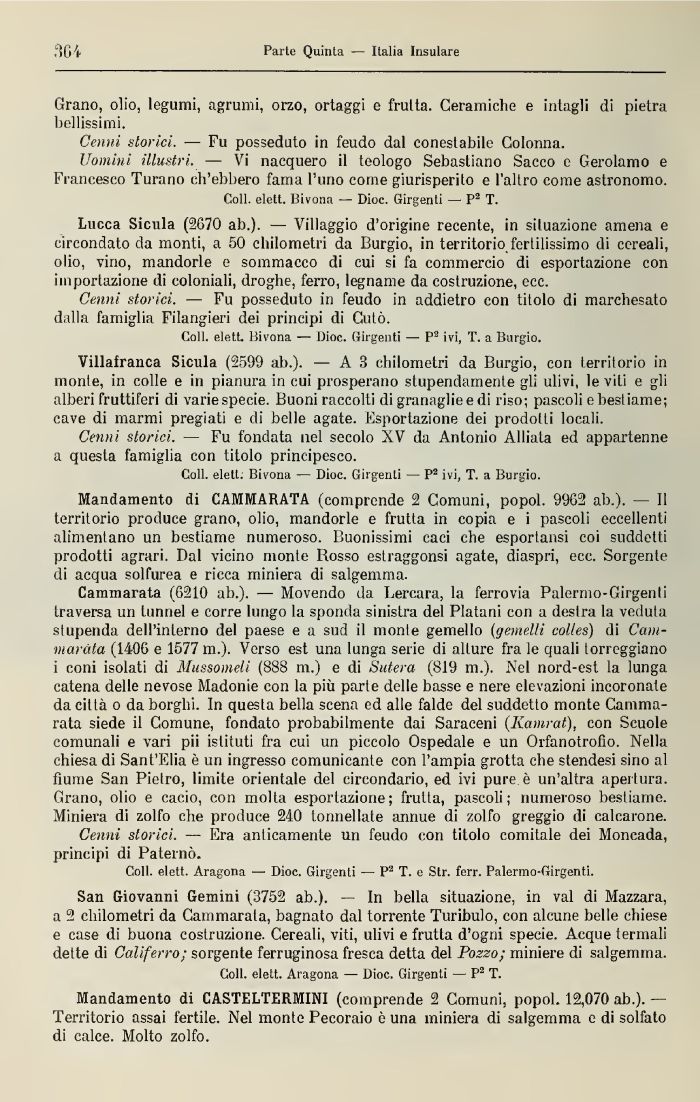 Mandamento dμ CAMMARATA (comprende 2 Comuni, popol. 9962 ab.). Il territorio produce grano, olio, mandorle e frutta in copia e i pascoli eccellenti alimentano un bestiame numeroso. Buonissimi caci che esportatisi coi suddetti prodotti agrari. Dal vicino monte Rosso estraggonsi agate, diaspri, ecc. Sorgente di acqua solfurea e ricca miniera di salgemma.