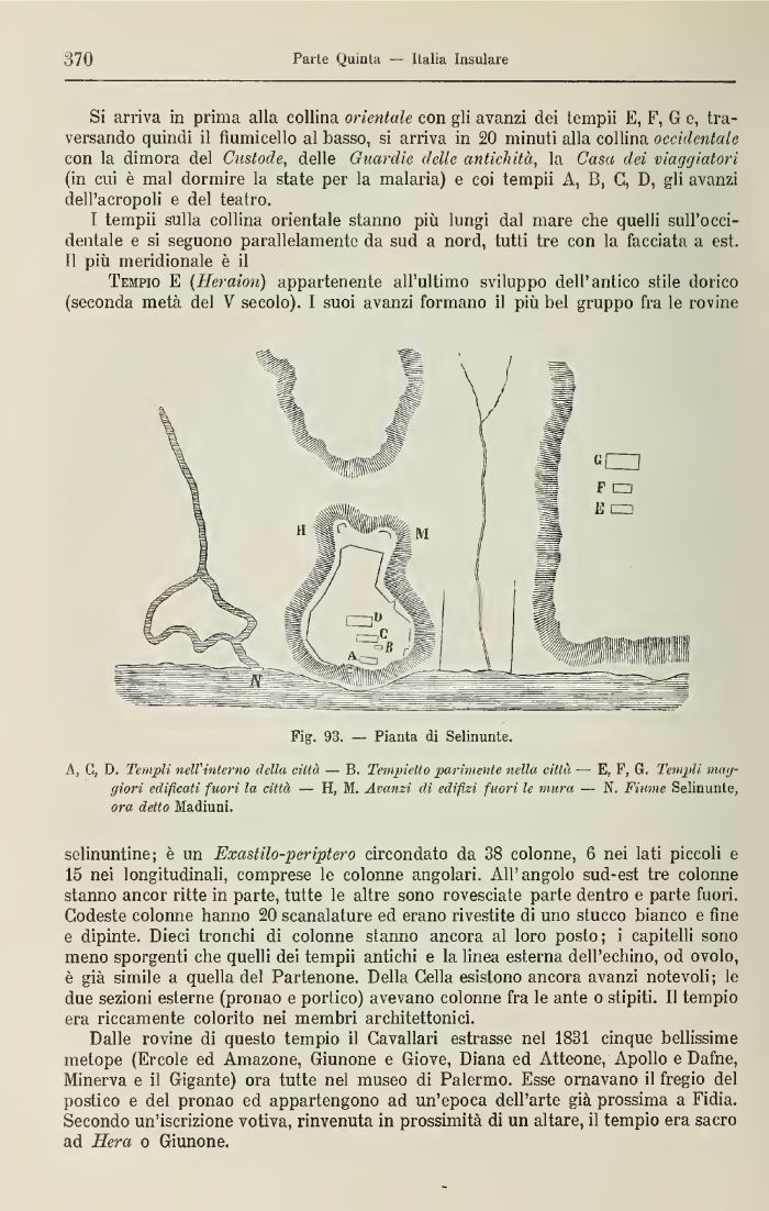 A, C, D. Templi nelVintemo della città — 13. Tempietto parimente nella città — E, F, G. Templi maggiori edificati fuori la città — H, M. Avanzi di edifizì fuori le mura — N. Fiume Selinunte, ora detto Madiuni,