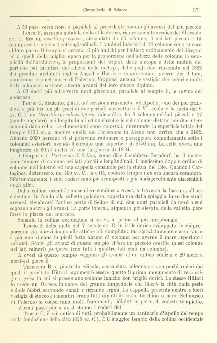 11 tempio è il Partenone di Sclino, come dice il suddetto Berndorf, ha il medesimo numero di colonne nei lati piccoli e longitudinali, il medesimo doppio ordine di colonne nell'interno ed una cappella consimile per la statua del Dio. Quando i Cartaginesi distrussero, nel 409 av. G., la città, codesto tempio non era ancora compiuto. Sfortunatamente i suoi ruderi sono più scomposti e più malagevolmente discernibili degli altri.