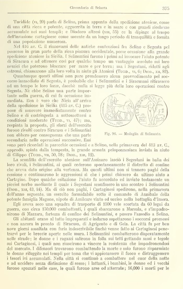 Tucidide (vi, 20) parla di Solino, prima appunto della spedizione ateniese, come di una città ricca e potente, agguerrita in terra e in mare e con grandi ricchezze accumulate nei suoi templi : e Diodoro altresì (xm, 55) ce la dipinge al tempo dell'invasione cartaginese come uscente da un lungo periodo di tranquillità e fornita di una popolazione numerosa.