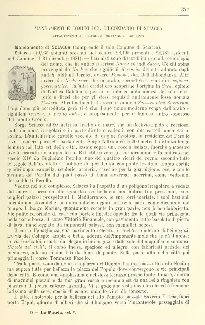 Sciacca ( 1 ',),%¦) abitanti presenti nel centro, 22,195 presenti e 22,184 residenti nel Comune al 31 dicembre 1881). — I cronisti sono discordi intorno alla etimologia