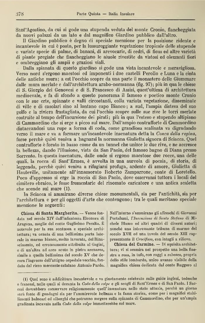 (1) Quel seno è addirittura incantevole e va giustamente celebrato sulle guide inglesi, tedesche e francesi, nelle quali si decanta la Coda della volpe e gli scogli di Sant'Ermes e di San Paolo. I Saccesi dovrebbero conservare religiosamente quell'insenatura nello stato attuale, perchè un giorno sarà fonte di guadagni sia per l'ammirevole bellezza e la fama storica, come per i magnifici stabilimenti balneari ed alberghi che potranno sorgere sulla spianata di Cammordino, che per un'ampia gradinata incavata nella Coda della volpe immetterebbe sul mare.