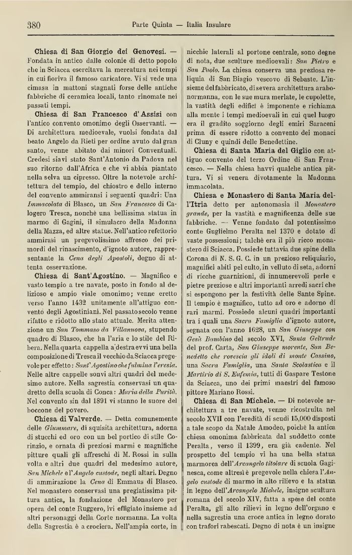 Chiesa e Monastero di Santa Maria del-l'Itria detto per antonomasia il Monastero grande, per la vastità e magnificenza delle sue fabbriche, j— Venne fondato dal potentissimo conte Guglielmo Peralta nel 1370 e dotato di vaste possessioni; talché era il più ricco monastero di Sciacca. Possiede tuttavia due spine della Corona di N. S. G. C. in un prezioso reliquiario, magnifici abiti pel culto, in velluto di seta, adorni di ricche guarnizioni, di innumerevoli perle e pietre preziose e altri importanti arredi sacri che si espongono per la festività delle Sante Spine. Il tempio è magnifico, tutto ad oro e adorno di rari marmi. Possiede alcuni quadri importanti tra i quali una Sacra Famiglia d'ignoto autore, segnata con l'anno 1628, un San Giuseppe, con Gesù Bambino del secolo XVI, Santa Geltrude del prof. Carta, San Giuseppe morente, San Benedetto che rovescia gli idoli di monte Cassino, una Sacra Famiglia, una Santa Scolastica e il Martìrio di S. Eufemia, tutti di Gaspare Testone da Sciacca, uno dei primi maestri del famoso pittore Mariano Bossi.