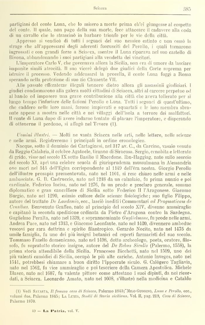 (1) Vedi Savasta, Il famoso caso di Sciacca, Palermo 1S43;~Milo-Guggino, Luna e Perollo, ecc., volumi due, Palermo 1845; La Lumia, Studii di Storia siciliana. Voi. II, pag. 219, Caso di Sciacca, Palermo 1870.
