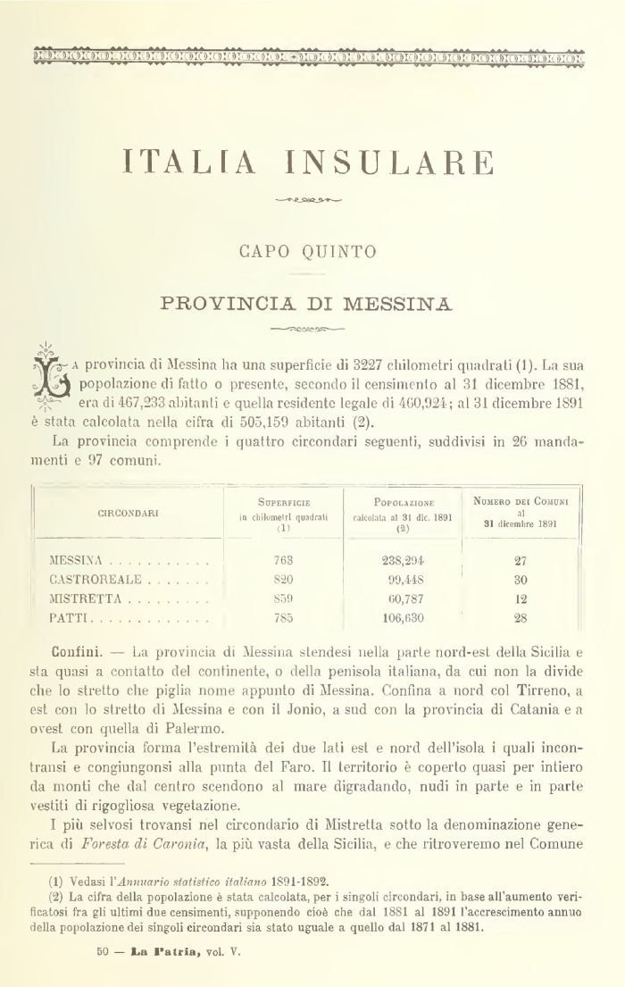 Vr A provincia di Messina ha una superfìcie di 3227 chilometri quadrati (J). La sua cJL^J popolazione di fatto o presente, secondo il censimento al 31 dicembre 1881, era di 467,233 abitanti e quella residente legale di 460,924; al 31 dicembre 1891 è stata calcolata nella cifra di 505,159 abitanti (2).