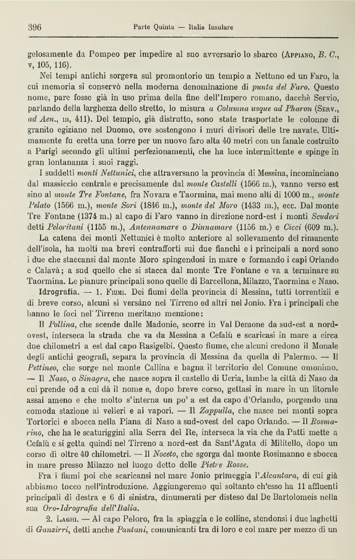 II Pollina, che scende dalle Madonie, scorre n Val Demone da sud-est a nordovest, interseca la strada elio va da Messina a Cefalù e scaricasi in mare a circa due chilometri a est dal capo llasigelbi. Questo fiume, che alcuni credono il Monale degli antichi geografi, separa la provincia di Messina da quella di Palermo. — 11 Pettineo, che sorge nel monte Cabina e bagna il territorio del Comune omonimo. — 11 Naso, o Smagra, che nasce sopra :! castello di Ucria, lambe la città di Naso da cui prende od a cui dà il nome e, dopo breve corso, gettasi in mare in un litorale assai ameno e che molto s'interna un po' a est da capo d'Orlando, porgendo una comoda stazione ai velieri e ai vapori. — 11 Zappulla, che nasce nei monti sopra Tortorici e sbocca nella Piana di Naso a sud-ovest del capo Orlando — 11 liosma-rino, che ha le scaluriggini alla Serra del Re, interseca la via che da Patti mette a Celalù e si getta quindi nel Tirreno a nord-est da Sant'Agata di Militello, dopo un corso di oltre 40 chilometri. — Il Noceto, che sgorga dal monte Rosimanno e sbocca in mare presso Milazzo nel luogo detto delle Pietre Rosse.