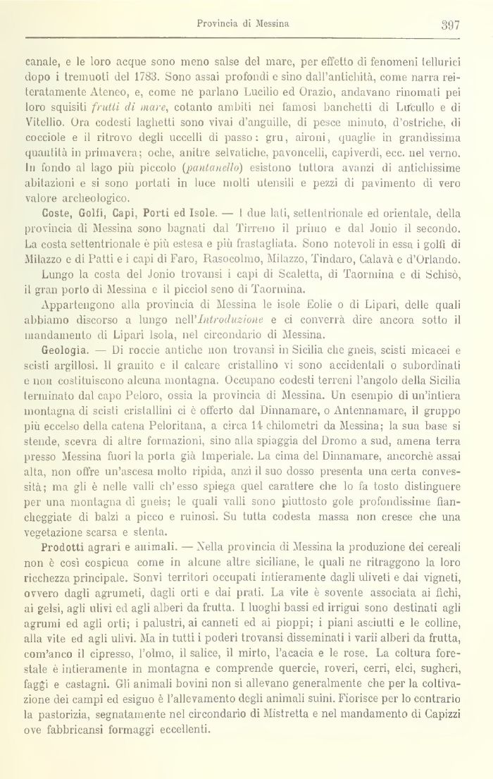 Geologia. — Di roccie antiche 11011 trovansi in Sicilia che gneis, scisti micacei e scisti argillosi. Il granito e il calcare cristallino vi sono accidentali o subordinati e 11011 costituiscono alcuna montagna. Occupano codesti terreni l'angolo della Sicilia terminato dal capo Peloro, ossia la provincia di Messina. Un esempio di un'intiera montagna di scisti cristallini ci è offerto dal Dinnaniare, o Antennaniare, il gruppo più eccelso della catena Peloritana, a circa 14 chilometri da Messina; la sua base si stende, scevra di altre formazioni, sino alla spiaggia del Dromo a sud, amena terra presso Messina fuori la porta già Imperiale. La cima del Dinnamare, ancorché assai alta, non offre un'ascesa molto ripida, anzi il suo dosso presenta una certa convessità; ma gli è nelle valli ch'esso spiega quel carattere che lo fa tosto distinguere per una montagna di gneis; le quali valli sono piuttosto gole profondissime fiancheggiate di balzi a picco e ramosi Su tutta codesta massa non cresce che una vegetazione scarsa e stenta.