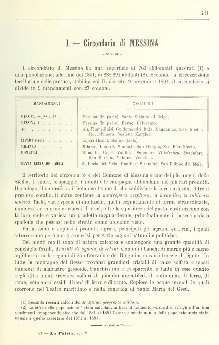 Il circondario di Messina ha una superficie di 703 chilometri quadrati (1) e una popolazione, alla fine del 1801, di 238.291- abitanti (2). Secondo la circoscrizione territoriale delle preture, stabilita col R. decreto 9 novembre 1891, il circondario si divide in 9 mandamenti con 27 comuni.