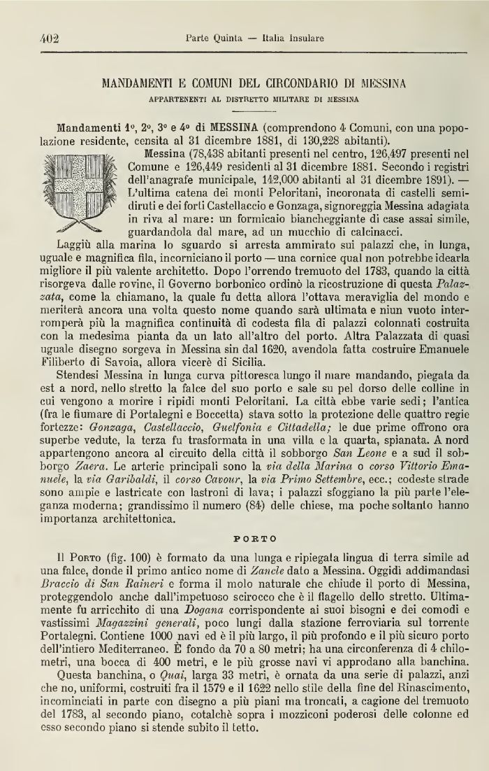 Il Porto (fig. 100) è formato da una lunga e ripiegata lingua di terra simile ad una falce, donde il primo antico nome di Zancle dato a Messina. Oggidì addimandasi Braccio di San Raineri c forma il molo naturale che chiude il porto di Messina, proteggendolo anche dall'impetuoso scirocco che è il flagello dello stretto. Ultimamente fu arricchito di una Dogana corrispondente ai suoi bisogni e dei comodi e vastissimi Magazzini generali, poco lungi dalla stazione ferroviaria sul torrente Portalegni Contiene 1000 navi ed è il più largo, il più profondo e il più sicuro porto dell'intiero Mediterraneo. È fondo da 70 a 80 metri; ha una circonferenza dì 4 chilometri, una bocca di 400 metri, e le più grosse navi vi approdano alla banchina.