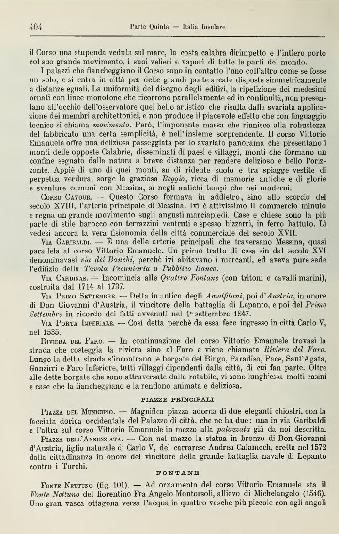 Fonte Nettuno (fig. 101). — Ad ornamento del corso Vittorio Emanuele sta il Fonte Nettuno del fiorentino Fra Angelo Montorsoli, allievo di Michelangelo (1516). Una gran vasca ettagona versa l'acqua in quattro vasche più piccole con agli angoli