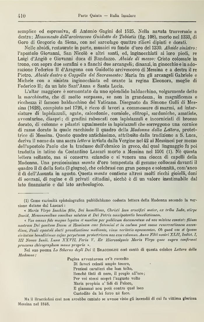 L'aitar maggiore è sormontato da uno splendido baldacchino, volgarmente detlo la macchinetta, che di mollo sorpassa, se non in grandezza, in magnificenza e ricchezza il famoso baldacchino del Vaticano. Disegnato da Simone Culli di Messina (1028), compiuto nel 1726, è ricco di lavori a commessure di marmi, ad intarsiature di lapislazzuli, agate, calcedonie, corniole, elitropi, sardoniche, amatiste, avventurine, diaspri ; di gradini rabescati con lapislazzulì e incorniciati di bronzo dorato, di colonne e pilastri ugualmente in lapislazzuli che sorreggono una cornice di rame dorato la quale racchiude il quadro della Madonna della Lettera, protettrice di Messina. Questo quadro antichissimo, attribuito dalla tradizione a S. Luca, deriva il nome da una sacra lettera inviata dalla Vergine nel 42 ai Messinesi per mezzo dell'apostolo Paolo die la tradusse dall'ebraico in greco, dal qual linguaggio fu poi tradotta in latino da Costantino Lascari morto a Messina nel 1501 (1). Nò questa lettera soltanto, ma si conserva eziandio e si venera una ciocca di capelli della Madonna. Una preziosissima manta d'oro tempestata di gemme collocasi davanti il quadro il dì della festa (3 giugno), che celebrasi con gran pompa e solennità, eom'anco il dì dell'Assunta in agosto. Questa manta contiene altresì molti ricchi gioielli, doni di sovrani, di regine e di privati cittadini, sicché è di un valore inestimabile dal lato finanziario e dal lato archeologico.