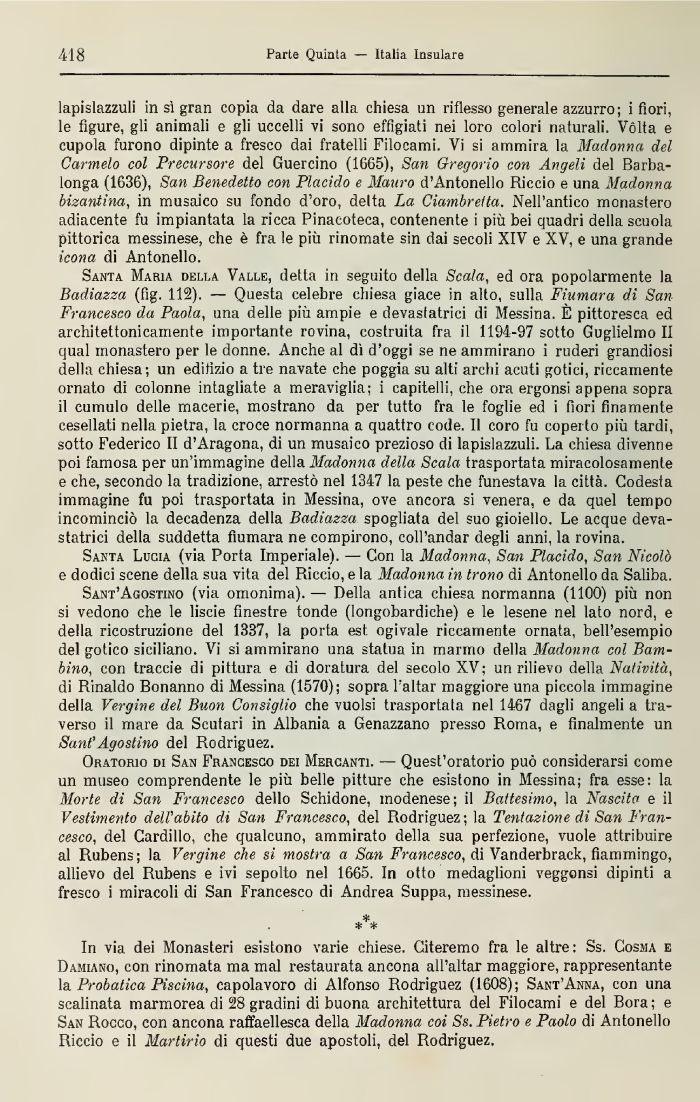 Santa Maria della Valle, detta in seguito della Scala, ed ora popolarmente la Badiazza (fig. 112). — Questa celebre chiesa giace in alto, sulla Fiumara di San Francesco da Paola, una delle più ampie e devastatrici di Messina. È pittoresca ed architettonicamente importante rovina, costruita fra il 1194-97 sotto Guglielmo II qua! monastero per le donne. Anche al dì d'oggi se ne ammirano i ruderi grandiosi della chiesa; un editlzio a tre navate che poggia su alti archi acuti gotici, riccamente ornato di colonne intagliate a meraviglia; I capitelli, che ora ergonsi appena sopra d cumulo delle macerie, mostrano da per tutto fra le foglie ed i fiori finamente cesellati nella pietra, la croce normanna a quattro code. Il coro fu coperto più tardi, sotto federico II d'Aragona, di un musaico prezioso di lapislazzuli. La chiesa divenne poi famosa per un'immagine della Madonna della Scala trasportata miracolosamente e che, secondo la tradizione, arrestò nel 1347 la peste che funestava la città. Codesta immagine fu poi trasportata in Messina, ove ancora si venera, e da quel tempo incominciò la decadenza della Badiazza spogliata del suo gioiello. Le acque devastatrici della suddetta fiumara ne compirono, coll'andar degli anni, la rovina.