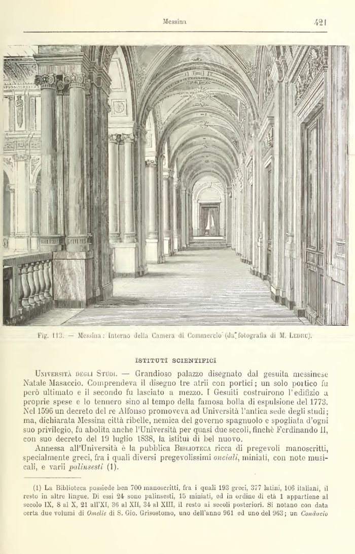 Università degli Studi, — Grandioso palazzo disegnato dal gesuita messinese Natale Masaccio. Comprendeva il disegno tre atrii con portici; un solo poitico fu però ultimato e il secondo fu lasciato a mezzo. 1 Gesuiti costruirono l'edilizio a proprie spese e lo tennero sino al tempo della famosa bolla di espulsione del 1773. Nel 1596 un decreto del re Alfonso promoveva ad Università l'antica sede degli studi; ma, dichiarata Messina città ribelle, nemica del governo spagnuolo e spogliata d'ogni suo privilegio, fu abolita anche l'Università per quasi due secoli, finché Ferdinando II, con suo decreto del 19 luglio 1838, la istituì di bel nuovo.