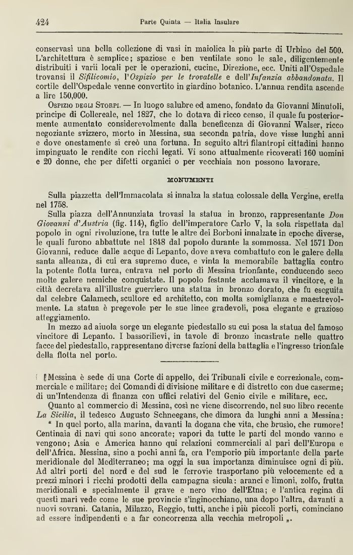 Sulla piazza dell'Annunziata trovasi la statua in bronzo, rappresentante Don Giovanni d'Austria (fig. 114), figlio dell'imperatore Carlo V, la sola rispettata dal popolo in ogni rivoluzione, tra tutte le altre dei Borboni innalzate in epoche diverse, le quali furono abbattute nel 1848 dal popolo durante la sommossa. Nel 1571 Don Giovanni, reduce dalle acque dì Lepanto, dove aveva combattuto con le galere della santa alleanza, di cui era supremo duce, e vinta la memorabile battaglia contro la potente flotta turca, entrava nel porto di Messina trionfante, conducendo seco molte galere nemiche conquistate. Il popolo festante acclamava il vincitore, e la città decretava all'illustre guerriero una statua in bronzo dorato, che fu eseguita dal celebre Calamech, scultore ed architetto, con molta somiglianza e maestrevolmente. La statua è pregevole per le sue linee gradevoli, posa elegante e grazioso atleggiamento.