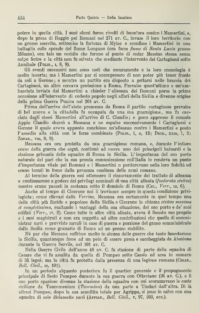 Anche al tempo di Cicerone noi li troviamo sempre in questa condizione privilegiata ; come rilevasi dalle Verrine, Messana era certamente tn quel tempo una delle città più floride e popolose della Sicilia e Cicerone la chiama civitas maxima et completissima, esaltando i vantaggi della sua situazione, del suo porto e de' suoi edifizii ( Verr., ìv, 2). Come tutte le altre città alleate, aveva il Senato suo proprio e i suoi magistrati e non era soggetta ad altre contribuzioni che quella di somministrar navi e provviste navali in caso di guerra e porzione del grano somministrato dalla Sicilia come granario di Roma ad un prezzo stabilito.