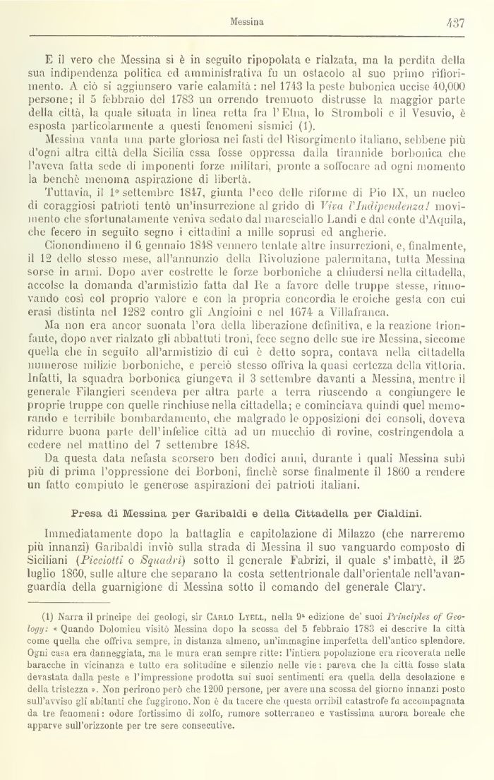 (1) Narra il principe dei geologi, sir Carlo Lyell, nella 9a edizione de' suoi Principles of Geologi): « Quando Dolomieu visitò Messina dopo la scossa del 5 febbraio 1783 ei descrive la città come quella che offriva sempre, in distanza almeno, un'immagine imperfetta dell'antico splendore. Ogni casa era danneggiala, ma le mura eran sempre ritte: l'intiera popolazione era ricoverata nelle baracche in vicinanza e tutto era solitudine e silenzio nelle vie : pareva che la città fosse slata devastata dalla peste e l'impressione prodotta sui suoi sentimenti era quella della desolazione e della tristezza ». Non perirono però che 1200 persone, per avere una scossa del giorno innanzi posto sull'avviso gli abitanti che fuggirono. Non è da tacere che questa orribil catastrofe fa accompagnata da tre fenomeni : odore fortissimo di zolfo, rumore sotterraneo e vastissima aurora boreale che apparve sull'orizzonte per tre sere consecutive.