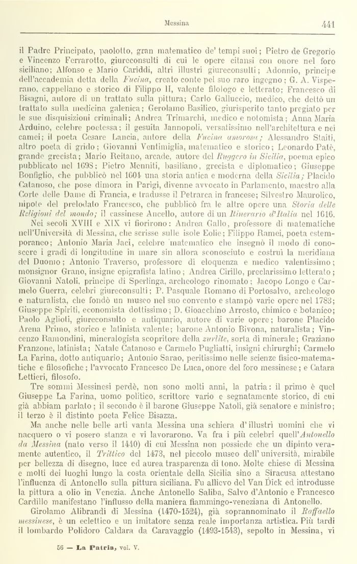 ti Padre Principato, paololto, gran matematico de'tempi suoi ; Pietro de Gregorio e Vincenzo Ferrarotto, giureconsulti di cui le opere citansi con onore nel foro siciliano; Alfonso e Mario Gariddi, altri illustri giureconsulti; Adonnio, principe dell'accademia detta della Fucina, creato conte pel suo raro ingegno ; G. A. Vispe-rano, cappellano e storico di Filippo li, valente filologo e letterato; Francesco di Bisagni, autore di un trattato sulla pittura; Carlo Galluccio, medico, che dettò un trattato sulla medicina galenica; Gerolamo Basilico, giurisperito tanto pregiato per le sue disquisizioni criminali; Andrea Trirnarchi, medico e notoniista; Anna Maria Arduino, celebre poetessa; il gesuita Jannopoli, versatissinio nell'architettura e nei carnei; il poeta Cesare Lancia, autore della Fucina amorosa; Alessandro Staiti, altro poeta di grido; Giovanni Ventimiglia, matematico e storico; Leonardo Paté, grande grecista; Mario licitano, arcade, autore del Ruggero in Sicilia, poema epico pubblicato nel 169S; Pietro Meliniti, basiftlno, grecista e diplomatico; Giuseppe Bonfiglio, che pubblicò nel 1604 una storia antica e moderna della Sicilia; Placido Calanoso, che pose dimora in Parigi, divenne avvocato in Parlamento, maestro alla Corte delle Dame di Francia, e tradusse il Petrarca in francese; Silvestro Muurolico, nipote del prelodafo Francesco, che pubblicò fra le altre opere una Storia delle Religioni del mondo; il cassinese Aliceli», autore di un Itinerario d'Italia nel 1616.