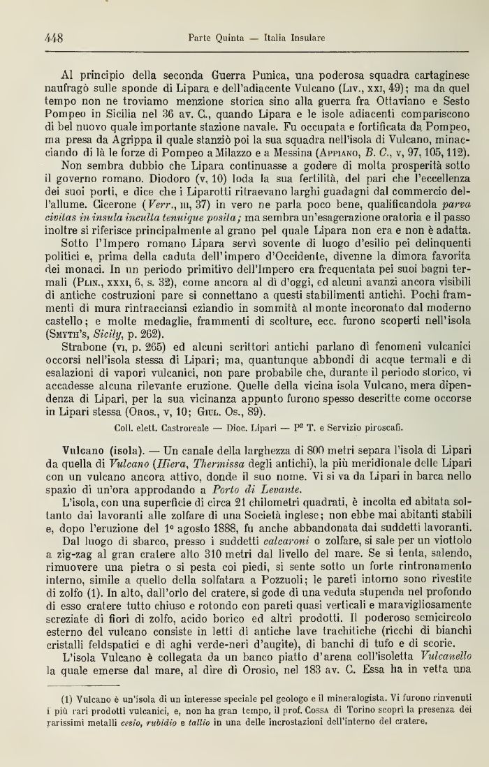 (1) Vulcano è un'isola di un interesse speciale pel geologo e il mineralogista. Vi furono rinvenuti i più rari prodotti vulcanici, e, non ha gran tempo, il prof. Cossa di Torino scoprì la presenza dei Rarissimi metalli cesio, rubidio e tallio in una delle incrostazioni dell'interno del cratere.