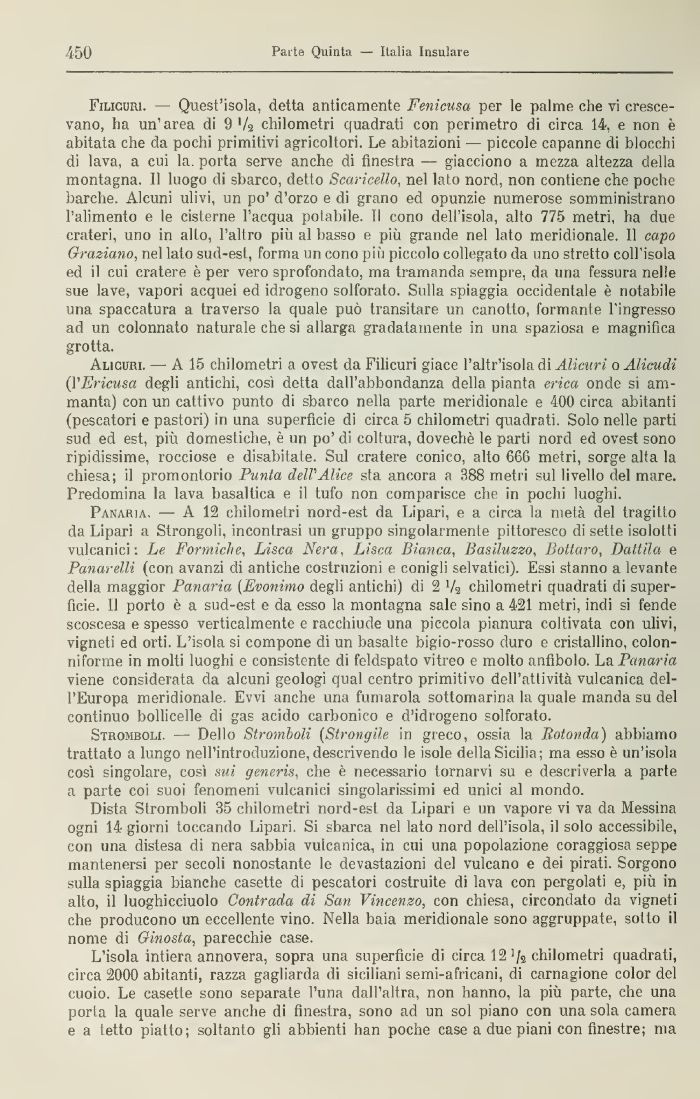 Fjlicuri. — Quest'isola, detta anticamente Fenicusa per le palme che vi crescevano, ha un'area di 9 V2 chilometri quadrati cori perimetro di circa 14, e non è abitata che da pochi primitivi agricoltori. Le abitazioni — piccole capanne di blocchi di lava, a cui lai porta serve anche di finestra — giacciono a mezza altezza della montagna. Il luogo di sbarco, detto Scancello, nel lato nord, non contiene che poche barche. Alcuni ulivi, un po' d'orzo e di grano ed opunzie numerose somministrano l'alimento e le cisterne l'acqua potabile II cono dell'isola, alto 775 metri, ha due crateri, uno ;n allo, l'altro più al basso e più grande nel lato meridionale. 11 capo Graziano, nel lato sud-est, forma un cono più piccolo collegato da uno stretto coll'isola ed il cui cratere è per vero sprofondato, ma tramanda sempre, da una fessura nelle sue lave, vapori acquei ed idrogeno solforato. Sulla spiaggia occidentale è notabile una spaccatura a traverso la quale può transitare un canotto, formante l'ingresso ad un colonnato naturale che si allarga gradatamente in una spaziosa e magnifica grotta.