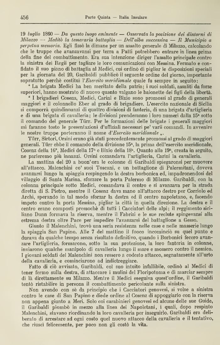 19 luglio 1860 — Da questo luogo eminente — Osservata la posizione dei dintorni di Milazzo —~ Meditò la temeraria battaglia — Dell'alba successiva — Il Municipio a perpetua memoria. Egli fissò la dimane per un assalto generale di Milazzo, calcolando che le truppe che avanzavansi per terra a Patti potrebbero entrare in linea prima della fine del combattimento. Era sua intenzione diriger l'assalto principale contro la sinistra dei Regii per tagliare le loro comunicazioni con Messina. Fermato e confidato il suo piano eli battaglia al Medici, cui ordinò di pigliar le disposizioni speciali per la giornata del 20, Garibaldi pubblicò il seguente ordine del giorno, importante sopratutto perchè costituì VEsercito meridionale quale fu sempre in seguito:
