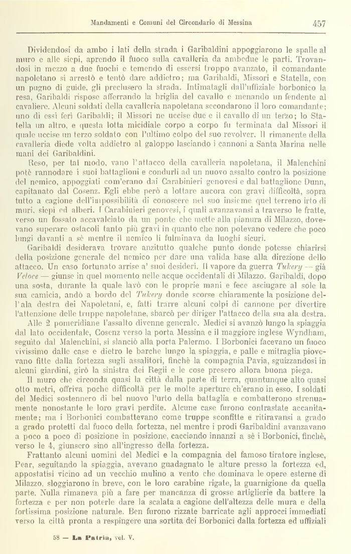 Il muro che circonda quasi la città dalla parte di terra, quantunque alto quasi otto metri, offriva poche difficoltà per le molte aperture ch'erano in esso. I soldati del Medici sostennero di bel nuovo l'urto della battaglia e combatterono strenuamente nonostante le loro gravi perdite. Alcune case furono contrastate accanitamente; ma i Borbonici combattevano come truppe sconfitte e ritiravansi a grado a grado protetti dal fuoco della fortezza, nel mentre i prodi Garibaldini avanzavano a poco a poco dì posizione in posizione, cacciando innanzi a sè i Borbonici, finché, verso le 4, giunsero sino all'ingresso della fortezza.