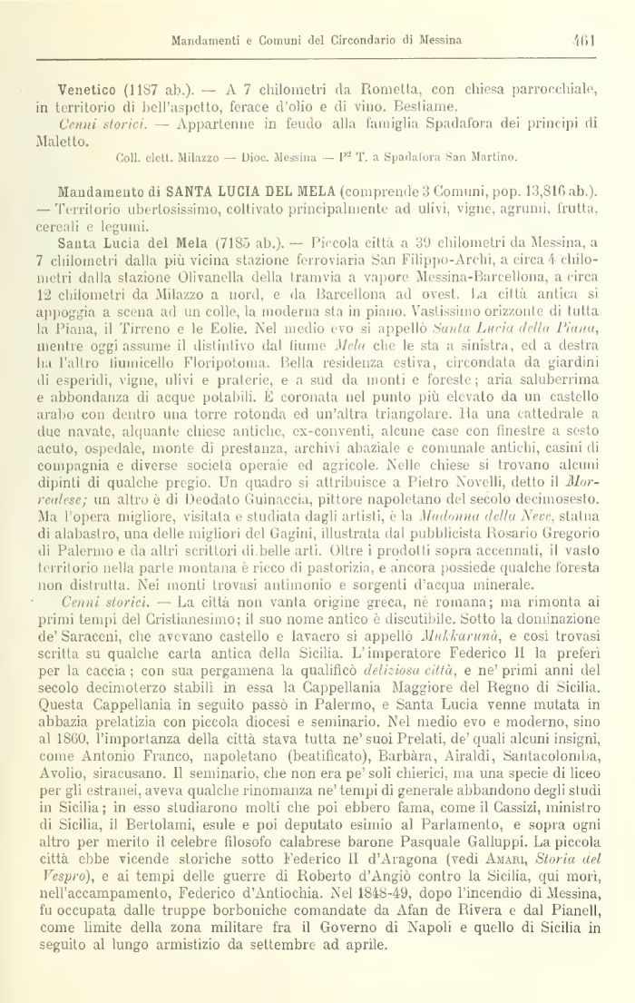 Santa Lucia del Mela (718') ab.). — Piccola città a 3fJ chilometri da Messina, a 7 chilometri dalla più vicina stazione ferroviaria San Filippo-Archi, a circa 4 chilometri dalla stazione Olivanella della tramvia a vaporo Messina-Barcellona, a circa 12 chilometri da Milazzo a nord, e da Barcellona ad ovest, ha città antica si appoggia a scena ad un colle, la moderna sta in piano. Vastissimo orizzonte di tutta la Piana, il Tirreno e le Eolie. Nel medio evo si appellò Sunta Lucia della Piana, mentre oggi assume il distintivo dal liume JIcla che le sta a sinistra, ed a destra ha l'altro iimnicello Floripotoma. Bella residenza estiva, circondata da giardini di esperidi, \igne, ulivi e praterie, e a sud da monti e foreste; aria saluberrima e abbondanza di acque potabili. E coronata nel punto più elevato da un castello arabo con dentro una torre rotonda ed un'altra triangolare. Ha una cattedrale a due navate, alquante chiese antiche, ex-conventi, alcune case con finestre a sesto acuto, ospedale, monte di prestanza, archivi abaziale e comunale antichi, casini di compagnia e diverse società operaie ed agricole. Nelle chiese si trovano alcuni dipinti di qualche pregio. Un quadro si attribuisce a Pietro Novelli, detto il Mor-realese; un altro è di Deodato Guinaccia, pittore napoletano del secolo decimosesto. Ma 1 opera migliore, visitala e studiata dagli artisti, è la IIndonna della Neve, statua di alabastro, una delle migliori del Gagini, illustrata dal pubblicista Bosario Gregorio di Palermo e da altri scrittori di.belle arti. Oltre i prodotti sopra accennati, il vasto territorio nella parte montana è ricco di pastorizia, e ancora possiede qualche foresta non distrutta. Nei monti trovasi antimonio e sorgenti d'acqua minerale.