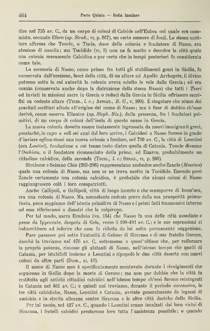 dire rie! 735 av. G., da un corpo di coloni di Calcide nell'Eubea col quale era commisto, secondo Eforo (ap. Strab,, vi, p. 267), un certo numero di Jonii. Lo stesso scrittore afferma che Teocle, o Tucle, duce della colonia e fondatore di Nasso, era ateniese di nascita ; ma Tucidide (vi, 3) non ne fa motto e descrive la città quale una colonia meramente Calcidica e par certo che in tempi posteriori fu considerata come tale.