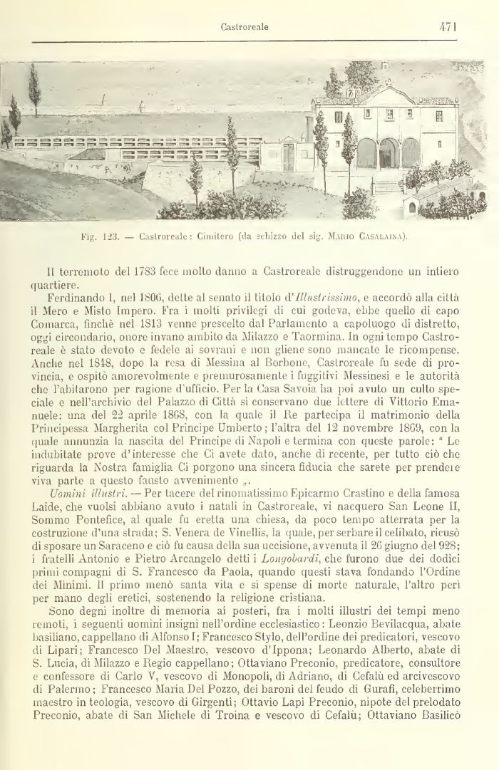 Ferdinando 1, nel 1806, dette al senato il titolo d'Illustrissimo, e accordo alla città il Mero e Misto Impero. Fra i molti privilegi di cui godeva, ebbe quello di capo Coniami, finché nel 1813 venne prescelto dal Parlamento a capoluogo di distretto, oggi circondario, onore invano ambito da Milazzo e Taormina. In ogni tempo Castro-reale è stato devoto e fedele ai sovrani e non gliene sono mancate le ricompense. Anche nel 181-8, dopo la resa di Messina al Borbone, Caslroreale fu sede di provincia, e ospitò amorevolmente e premurosamente i fuggitivi Messinesi e le autorità che l'abitarono per ragione d'ufficio. Per la Casa Savoia lia poi avuto un culto speciale e nell'archivio del Palazzo di Città si conservano due lettere di Vittorio Emanuele: una del 22 aprile 1868, con la quale il Ile partecipa il matrimonio della Principessa Margherita col Principe Umberto ; l'altra del 12 novembre 1869, conia quale annunzia la nascita del Principe di Napoli e termina con queste parole: Le indubitate prove d'interesse che Ci avete dato, anche di recente, per lutto cièche riguarda la Nostra famiglia Ci porgono una sincera fiducia che sarete per prendere viva parte a questo fausto avvenimento „,