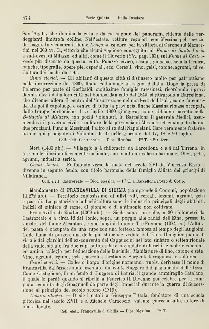 Sant'Agata, che domina la città e da cui si gode del panorama ridente delle verdeggianti limitrofe colline, Nell'estate, vetture regolari con Messina pel servizio dei bagni In vicinanza il fiume Longano, celebre per la vittoria di Gerone sui Mamer-tini nel 200 av. G., vittoria che alcuni vogliono conseguita sul Fiume di Santa Lucia a sud-ovest di Milazzo, ed altri, come il Cluverio (Sic., pag. 303), sul Fiume dì Castro-reale più discosto da questa città. Palazzo civico, casino, ginnasio, scuola tecnica, banche, tipografie, opere pie, ospedali, ecc. Cereali, vino, gelsi, cotone, agrumi, ulive Coltura dei bachi da seta.