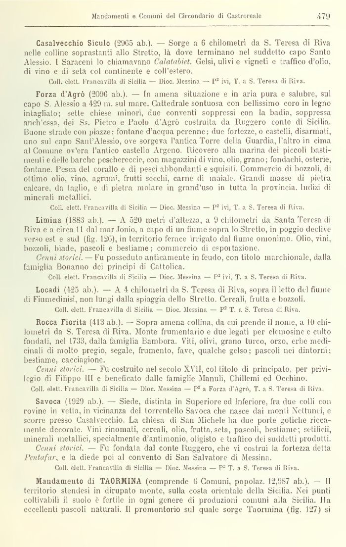 Mandamento di TAORMINA (comprende 6 Comuni, popolaz. 12,987 ab.). — 11 territorio stende®! in dirupato monte, sulla costa orientale della Sicilia. Nei punti coltivabili il suolo è fertile in ogni genere di produzioni comuni alla Sicilia. Ila eccellenti pascoli naturali II promontorio sul quale sorge Taormina (fìg. 127) si