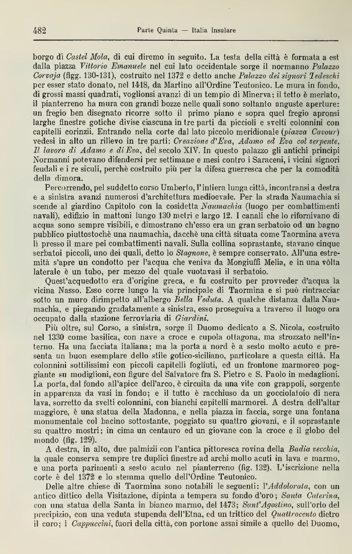 borgo di Castel Mola, di cui diremo in seguito. La testa della città è formata a est dalla piazza Vittorio Emanuele nel cui lato occidentale sorge il normanno Palazzo Corvaja (figg. 130-131), costruito nel 1372 e detto anche Palazzo dei signori le.deschi per esser stato donato, nel 1418, da Martino all'Ordine Teutonico, Le mura in fondo, di grossi massi quadrati, voglionsi avanzi di un tempio di Minerva; il tetto è merlato, il pianterreno ha mura con grandi bozze nelle quali sono soltanto anguste aperture; un fregio ben disegnato ricorre sotto il primo piano e sopra quel fregio apronsi larghe finestre gotiche divise ciascuna in tre parti da piccioli e svelti colonnini con capitelli corinzi! Entrando nella corte dal lato piccolo meridionale (piazza Cavour) vedesi in alto un rilievo in tre parti: Creazione d'Eva, Adamo ed Eva col serpente, lì lavoro di Adamo e di Eva, del secolo XIV. In questo palazzo gli antichi principi Normanni potevano difendersi per settimane e mesi contro i Saraceni, i vicini signori feudali e i re siculi, perchè costruito più per la difesa guerresca che per la comodità della dimora.