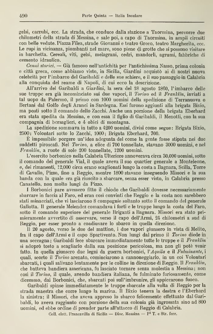 Cenni storici. — Già famoso nell'antichità per l'antichissima Nasso, prima colonia e città greca, come abbiamo visto, in Sicilia, Giardini acquistò ai dì nostri nuova celebrità per l'imbarco del Garibaldi e delle sue schiere, e il suo passaggio in Calabria alla conquista del reame di Napoli, di cui ecco la descrizione.