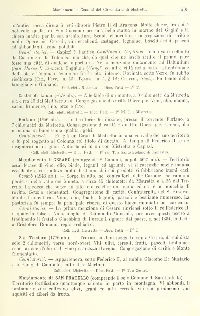 Castel di Lucio (2678 ab.). — Alle falde di un monte, a 9 chilometri da Mistretta e a circa 15 dal Mediterraneo. Congregazione di carità, Opero pie. Vino, olio, manna, cacio, frumento, lino, orzo e fave.