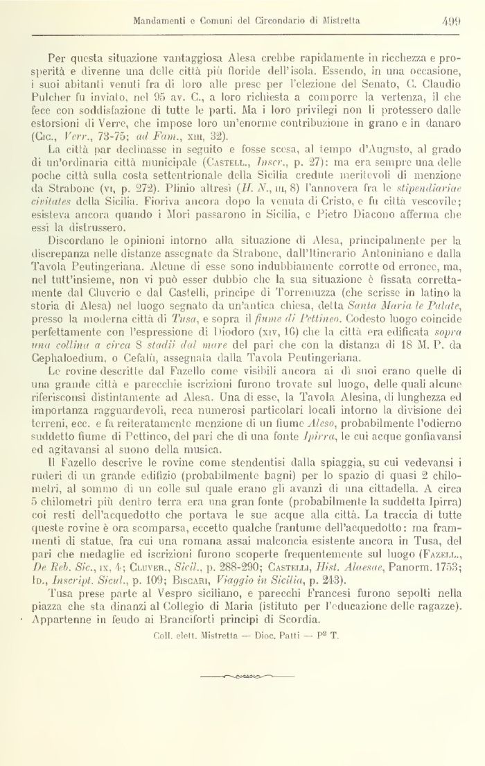 Le rovine descritte dal Fazello come visibìli ancora ai di suoi erano quelle dì una grande città e parecchie iscrizioni furono trovate sul luogo, delle quali alcune ri ferisco lisi distintamente ad Alesa. Una di esse, la Tavola A lesina, di lunghezza ed importanza ragguardevoli, reca numerosi particolari locali intorno la divisione dei terreni, ecc. e fa reiteratamente menzione di un fiume Aleso, probabilmente l'odierno suddetto fiume di Pettineo, del pari che di una fonte Jpirra, le cui acque gonfiavansi ed agitavansi al suono della musica.