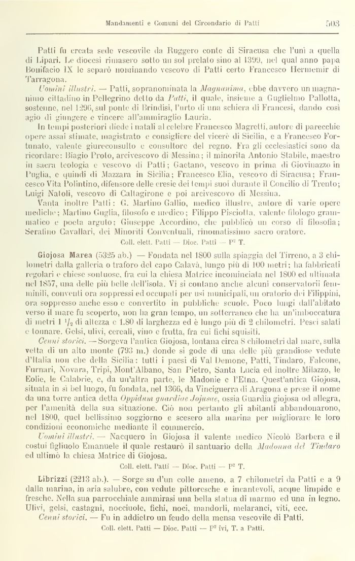 Librizzi (2213 ab,). — Sorge su d'un colle ameno, a 7 chilometri da Patti e a 9 dalla marina, ili aria salubre, con vedute pittoresche e incantevoli, acque lìmpide e fresche. Nella sua parrocchiale ammirasi una bella statua di marmo ed una in legno. Ulivi, gelsi, castagni, nocciuole, fichi, noci, mandorli, melaranci, viti, ecc.