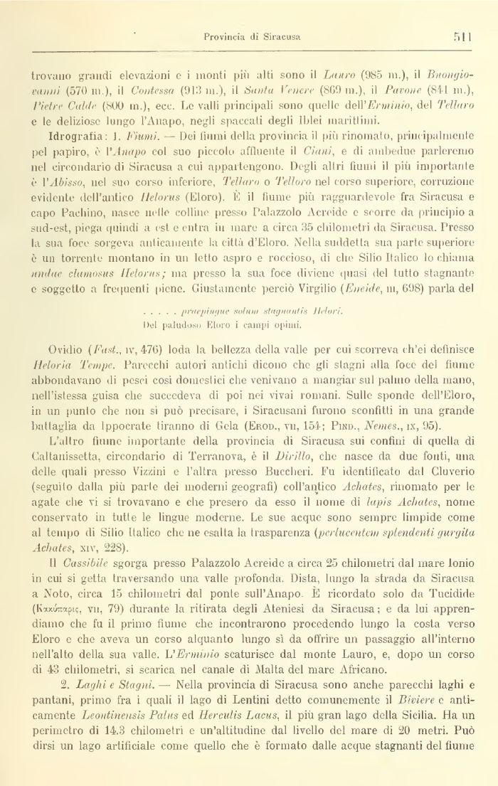 11 Cassibile sgorga presso Palazzolo Acreide a circa 25 chilometri dal mare Ionio in cui si getta traversando una valle profonda. Dista, lungo la strada da Siracusa a Noto, circa 15 chilometri dal ponte sull'Anapo. E ricordato solo da Tucidide (KaxuKapic, vii, 79) durante la ritirata degli Ateniesi da Siracusa; e da lui apprendiamo che fu il primo fiume che incontrarono procedendo lungo la costa verso Eloro e che aveva un corso alquanto lungo sì da offrire un passaggio all'interno nell'alto della sua valle. L'Erminio scaturisce dal monte Lauro, e, dopo un corso di 43 chilometri, si scarica nel canale di Malta del mare Africano.