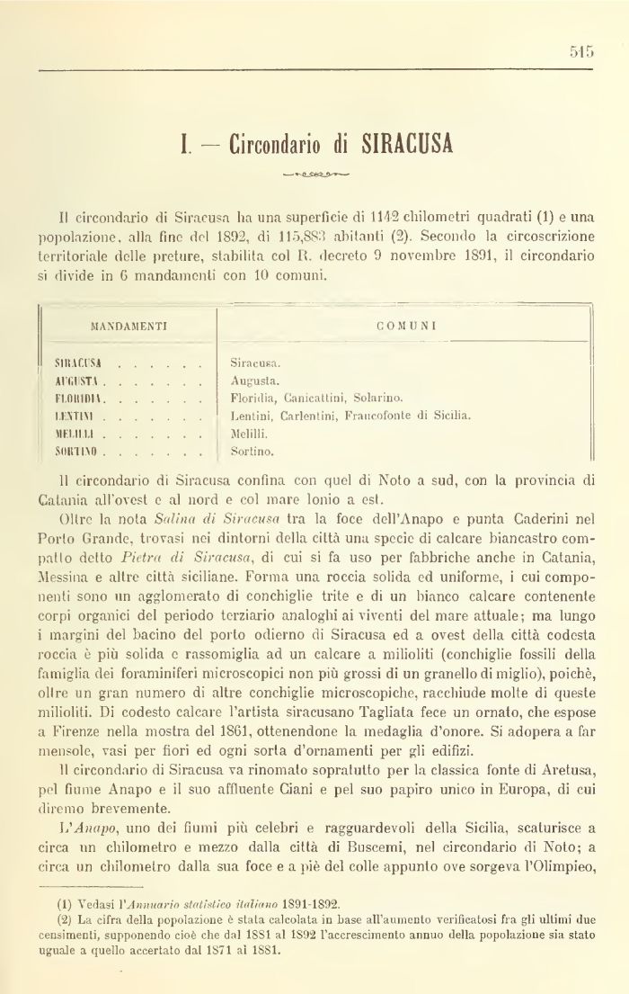 Il circondario di Siracusa ha una superficie di 1142 chilometri quadrati (l)euna popolazione, alla fine del 1892, di 115,883 aiutanti (2). Secondo la circoscrizione territoriale delle preture, stabilita col B. decreto 9 novembre 1891, il circondario si divide in 6 mandamenti con 10 comuni.