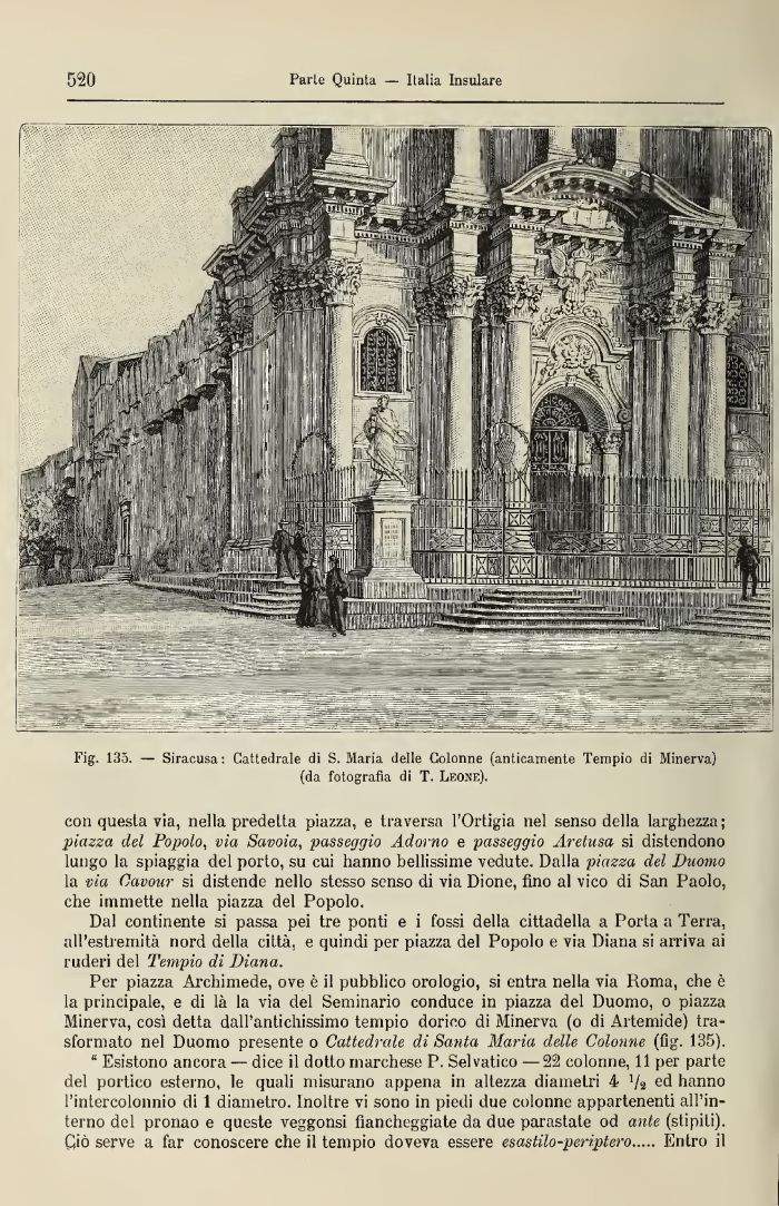 Per piazza Archimede, ove è il pubblico orologio, si entra nella via Roma, che è la principale, e di là la via del Seminario conduce in piazza del Duomo, o piazza Minerva, così detta dall'antichissimo tempio dorico di Minerva (o di Artemide) trasformato nel Duomo presente o Cattedrale di Santa Maria delle Colonne (fig. 135).