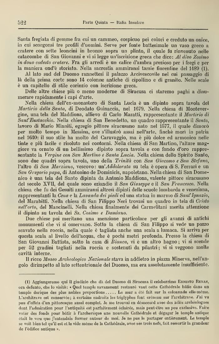 (1) Aggiungeremo qui il giudizio che dà del Duomo di Siracusa il celeberrimo Ernesto Renan, ora defunto, che lo visitò: * Quel tempie savamment restaurò vaut cette Cathédra.le bàtie dans un