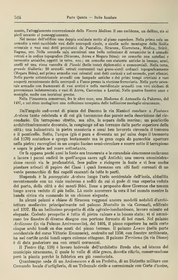 Il Teatro (fig. 138) è lavoro lodevole dell'architetto Broda che, ad istanza del municipio siracusano, il quale lo volle di stile greco, dovette rifarlo, conservandone però la pianta perchè la fabbrica era già cominciata.