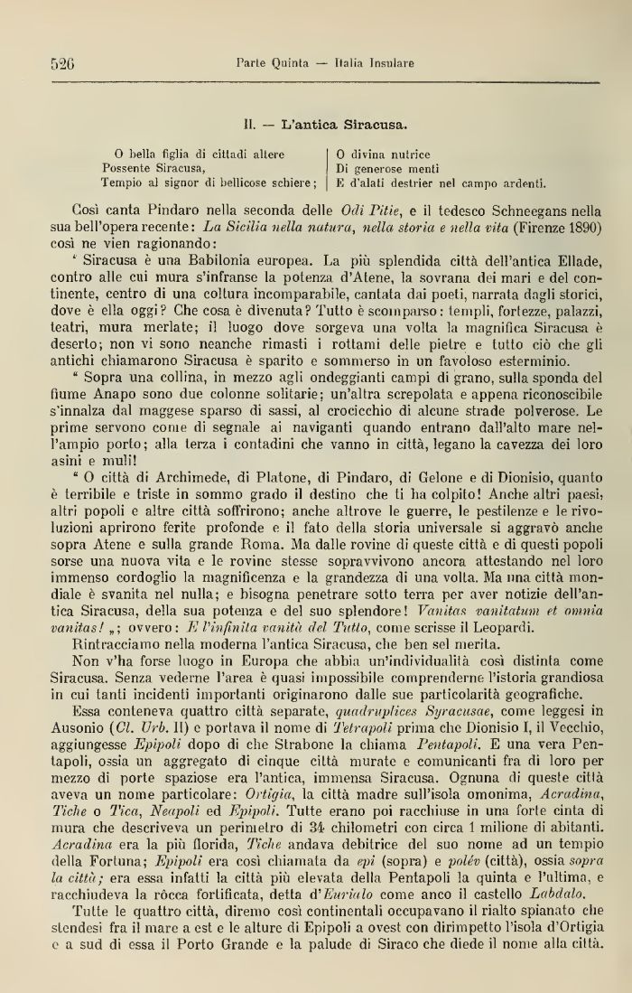 0 città di Archimede, di Platone, di Pindaro, di Gelone e di Dionisio, quanto è terribile e triste in sommo grado il destino che ti ha colpito ! Anche altri paesi, altri popoli e altre città soffrirono; anche altrove le guerre, le pestilenze e le rivoluzioni aprirono ferite profonde e il fato della storia universale si aggravò anche sopra Atene e sulla grande Roma. Ma dalle rovine di queste città e di questi popoli sorse una nuova vita e le rovine stesse sopravvivono ancora attestando nel loro immenso cordoglio la magnificenza e la grandezza di una volta. Ma una città mondiale è svanita nel nulla; e bisogna penetrare sotto terra per aver notizie dell'antica Siracusa, della sua potenza e del suo splendore ! Vanitas vanitxitum et omnia vanitasi „; ovvero : E Vinfinila vanità del Tutto, come scrisse il Leopardi.
