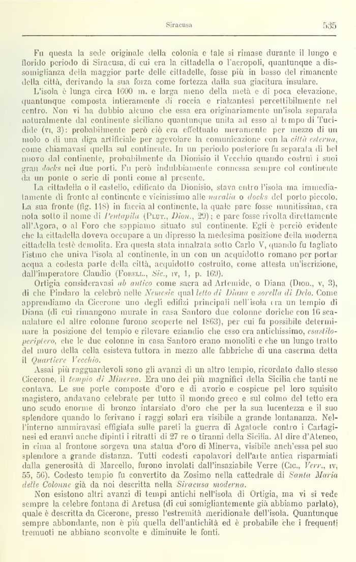 L'isola è lunga circa 1GQ0 in. e larga meno della metà e di poca elevazione, quantunque composta intieramente di roccia e rialzantesi percettibilmente nel contro. Non vi ha dubbio alcuno che essa era originariamente un'isola separala naturalmente dal continente siciliano quantunque unita ad esso al tempo di Tucidide (vi, 3): probabilmente però ciò era effettualo meramente per mezzo di un molo o di una diga artificiale per agevolare la comunicazione con la città esterna, come chiamavasi quella sul conlincnte In un periodo posteriore fu separala di bel nuovo dal continente, probabilmente da Dionisio il Vecchio quando costruì ì suoi gran dochs nei due porti. Fu però indubbiamente connessa sempre col continente da un ponte o serie di ponti come al presente.