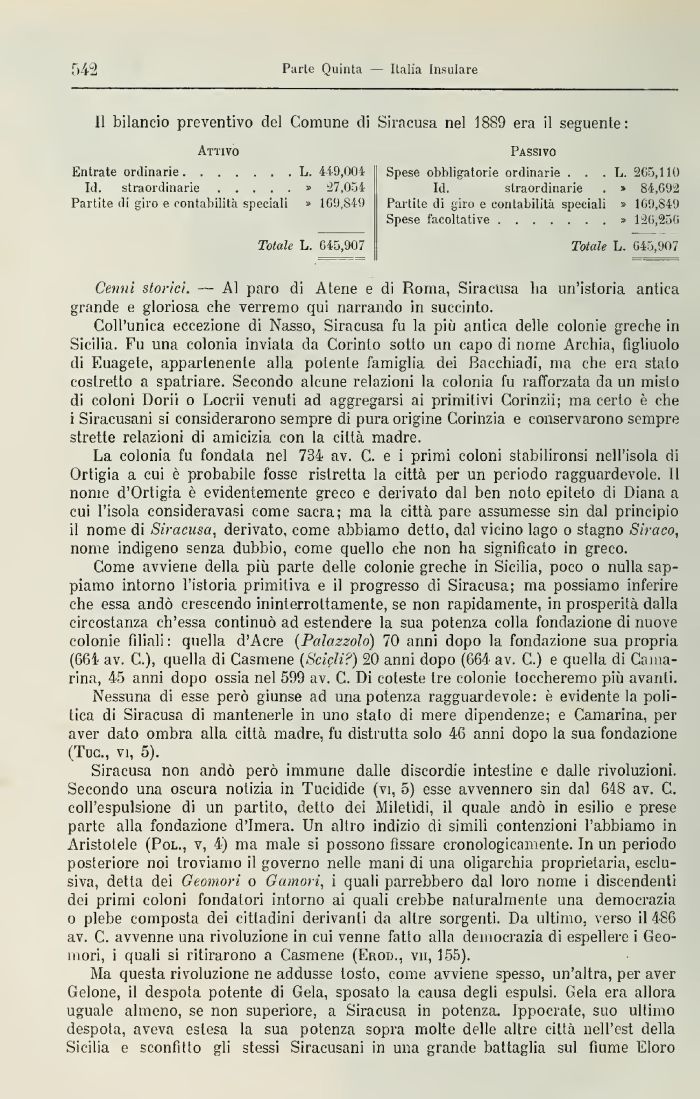il bilancio preventivo del Comune di Siracusa nel 1889 era il seguente: