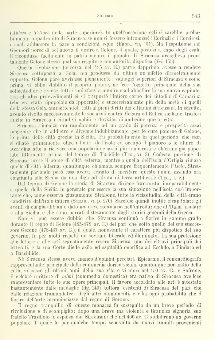 Dal tempo di Gelone la storia di Siracusa diviene frammista inseparabilmente a quella della Sicilia in generale per essere la sua situazione nell'isola cosi importante che, come osserva giustamente Strabene, tutte le vicissitudini della città erano condivise dall'isola intiera (Stfab., vi, p. 2701. Sarebbe quindi inutile ricapitolare gli eventi di cui già abbiamo dato un breve sommario nell'introduzione all'Italia Insulare e alla Sicilia, e che sono narrati distesamente dagli storici generali della Grecia.